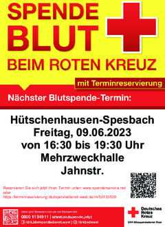 Der Ortsverein Moorbachtal e.V. des Deutschen Roten Kreuzes führt am Freitag, 9. Juni, in der Mehrzweckhalle in Spesbach, Jahnstraße, von 16.30 bis 19.30 Uhr einen Blutspendetermin durch. Da das Bürgerhaus in Hütschenhausen belegt ist, treffen wir uns ausnahmsweise in Spesbach.