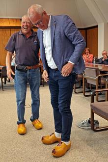 Bürgermeister Ralf Hechler schaut noch etwas ungläubig auf seine neuen Holzschuhe. Daneben freut sich Dick Radstake über die gelungene Überraschung.