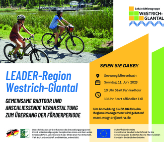 Auch wenn alle auf die neue Förderperiode gespannt sind, soll die vergangene Förderperiode nicht vergessen und gebührend verabschiedet werden. Dazu findet am Sonntag, 11. Juni, ab 10 Uhr eine gemeinsame Radtour statt, bei der LEADER-geförderte Projekte auf einer Teilstrecke der Pfälzer Seentour besichtigt werden. Anschließend bietet die LAG ab etwa 13 Uhr eine Veranstaltung am Seewoog in Miesenbach mit buntem Programm an. Sie möchten gerne bei der Veranstaltung ab 13 Uhr am Seewoog dabei sein? Dann melden Sie sich bitte beim Regionalmanagement (marc.wagner@entra.de)