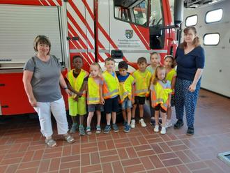Die Vorschulkinder der Kita “Bärenbusch“ aus Kottweiler-Schwanden besuchten am 14. Juni die Feuerwache in Ramstein. Herr Peter Fischer erwartete uns bereits und lud uns in die Schulungsräume ein. Wir erfuhren dort, wie wir selbst einen Notruf melden können, wie die Notrufzentrale funktioniert und welche Aufgaben Feuerwehrfrauen und Feuerwehrmänner ausüben (Retten, Löschen, Bergen, Schützen). Auch konnten wir bei der Wartung der Atemschutzgeräte mit dabei sein. Herr Fischer zeigte uns wie Ausrüstung und Kleidung der Feuerwehrleute und führte uns durch die Fahrzeughalle.