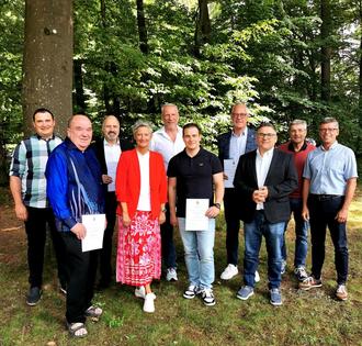 Freuen sich über rund 1 Million Euro von der RWG (v.l.): Reichswaldbevollmächtigter Felix Fauß, Beigeordneter John Hemm, Ortsbürgermeister Ralf Guckenbiehl, Oberbürgermeisterin Beate Kimmel, die Ortsbürgermeister Uli Zimmer und Achim Wätzold, Stadtbürgermeister Ralf Hechler sowie die Reichswaldbevollmächtigten Christian Dörr, Paul Junker und Thomas Layes.