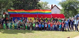Für die Kinder wurden im Anschluss verschiedene Workshops angeboten. Mit einer Regenbogen-Laufkarte sammelten die Kinder bei Riesen-Seifenblasen, Glitzer-Tattoos, Ausmalbilder, Schwungtuch und bunte Keilrahmengestaltung mit Sprühflaschen die verschiedenen Farben des Regenbogens.