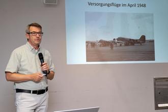 Zu Beginn gab Referent von Kostka einen Einblick in die Arbeit und die Ausstellungslandschaft des AlliiertenMuseums in Berlin. Im Anschluss führte er die Zuhörerinnen und Zuhörer durch die chronologische Abfolge der historischen Ereignisse im Kontext der Berliner Luftbrücke. Er erläuterte dabei die wichtigsten Stationen und Hintergründe sowie die dramatischen Umstände, die dazu führten.