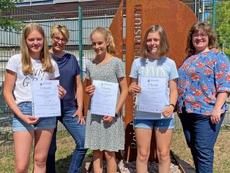 Physiklehrerin Annette Gottfriedsen und Schulleiterin Dr. Sonja Tophofen gratulierten den Preisträgerinnen, die alle die achte Klasse besuchen.
