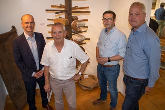 Museumsleiter Mario Aulenbacher, Förderkreis-Vorsitzender Roland Paul, 1. Beigeordneter der VG Marcus Klein und Bürgermeister Ralf Hechler (v.l.) während der Ausstellungseröffnung.