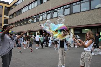 Mit Unterstützung des Jugendbüros und einigen ortsansässigen Kooperationspartnern wurde den Schülerinnen und Schülern mitsamt Familien und Freunden durch das Kollegium beim Schulfest am 1. Juli ein buntes Programm geboten. Neben Riesenseifenblasen, Hüpfburg und „Bubblesoccer“ konnten die Gäste ihre sportlichen und musikalischen Talente an einer Fußballstation, bei „Just Dance“ und Karaoke unter Beweis stellen. Trotz Nieselregen und Wind war das Fest von fröhlichen Gästen gut besucht. Neben einigen Getränke- und Süßspeiseangeboten von Schülern und Schülerinnen, bzw. dem Kollegium, sorgte der Förderverein „Jugend Pro“ mit Burgern und Bratwürstchen für das leibliche Wohl. Die Schulleitung und die Schulsozialarbeit möchten sich noch einmal ganz herzlich bei allen Mitwirkenden bedanken. Nach drei Jahren, in denen etwas Vergleichbares nicht stattfinden konnte, war es umso schöner, wieder in großer Schulgemeinschaft zusammen zu feiern.