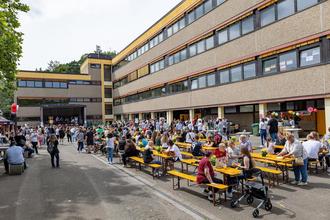 Bürgermeister Ralf Hechler und die kommissarische Schulleiterin Isabelle Chatfield eröffneten die das Fest am Freitagnachmittag und konnte dabei auch viele ehemaligen Lehrkräfte und Schüler begrüßen. Es war einiges an Programm geboten: Mitmachaktionen und Ausstellungen, Bühnenprogramm, Speis und Trank, Kaffee und Kuchen und die Live-Übertragung des deutschen EM-Spiels