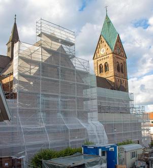Es ist nicht zu übersehen: rund um die St.-Nikolaus-Kirche in Ramstein, das Wahrzeichen der Stadt, wird zurzeit gearbeitet. Der „Dom im Moorbachtal“ ist mittlerweile komplett eingerüstet. Die Kirchenfassade versteckt sich hinter einem hohen mit Planen verhängten Gerüst. Wer den Kopf hebt sieht die Handwerker, die ihre Arbeit am Dach aufgenommen haben.