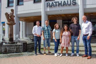 Gruppenbild mit Spanierinnen (v.l.): 1. Beigeordneter Marcus Klein, Markus Gödtel (Jugendbüro), Marie Carmen Patino, Saray Mendoza, Moritz Rödel und Bürgermeister Ralf Hechler.