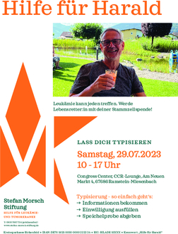 Der Ruhestand ist für den 65-jährigen Harald aus Spesbach in greifbarer Nähe. Endlich Zeit für alles, was er für den Job aufgeschoben hat. Doch schon wieder muss er seine Pläne einfrieren: Harald hat Leukämie. Damit er überleben kann, muss es jetzt schnell gehen – dringend wird ein passender Stammzellspender oder eine passende Spenderin gebraucht. Um die Lebensretterin oder den Lebensretter für ihn zu finden, wird an drei Terminen dazu aufgerufen, sich bei der Stefan-Morsch-Stiftung, Deutschlands erster Stammzellspenderdatei, zu typisieren.