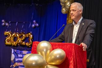 Unter den Klängen der Filmmusik aus dem US-amerikanischen Blockbuster Top-Gun und unter dem Beifall der zahlreichen Gäste betraten die Schülerinnen und Schüler den großen Saal im CCR. Eröffnet wurde die Feier mit einem Klavierstück, einfühlsam vorgetragen von Anastasia Mitrofanova aus der 10a. Die Bühne war hübsch dekoriert mit goldenen Girlanden, goldener Jahreszahl 2023 und gold- sowie silberfarbenen Luftballons. Sehr erfolgreich war offenbar der Englischunterricht, denn ein komplett englischsprachiges Banner zierte die Bühne mit der Aufschrift: „We are so proud of you - Congrats grad! - Class of 2023“.