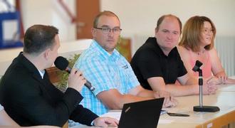 Ortsbürgermeister Achim Wätzold (mit Mikrofon) und die neu gewählten Beigeordneten Sven Radner, Uli Kohl und Barbara Baldauf.