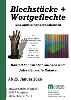 Wie eng diese Ausdrucksformen miteinander verbunden sind, zeigt die Ausstellung „Blechstücke + Wortgeflechte“ im Museum im Westrich in Ramstein. Zur Vernissage am Freitag, 23. Januar, um 19 Uhr, laden wir Sie herzlich ein.