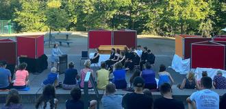 In der letzten Woche vor Beginn der Sommerferien fanden die Ramsteiner Schultheater-Wochen ihren krönenden Abschluss. Stand sieben Tage zuvor mit Molières „Der Eingebildete Kranke“ die sehr gelungene Inszenierung eines Klassikers aus dem Höfischen Theater des 18. Jahrhunderts auf dem Programm, wurde nun ein zeitgenössisches Theaterstück aufgeführt.