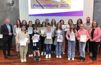 Preise des Landkreises haben Orell Amann (MSS 13), Philipp Geßner (MSS 13), Lea Vollmar (MSS 12), Nina Lenhardt (MSS 11), Lena Leyser (MSS 11), Jolina Röthke (MSS 11), Amelie Burkart (Klasse 10), Aurelia Rudolphi (Klasse 9), Lea Reiss (Klasse 8), Fiona Rose (Klasse 7), Veronika Alles (Klasse 6), Alan Jaroszuk (Klasse 6), Hande Cevik (Klasse 5) und Fynn Schneider (Klasse 5)gewonnen.