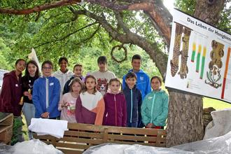 Rebecca Clark, Eckhard Richter, Linus und Tilly-Ella Müller entführten die zehn Kinder in die packende Welt der Bienen und verdeutlichten dabei deren Wichtigkeit in der Natur. So erfuhren die Kinder, dass eine Königin bis zu 2000 Eier am Tag legt, in einem Volk bis zu 50.000 Bienen auf engstem Raum leben und gut miteinander auskommen. Sie lernten aber auch, dass Bienen Wachs ausschwitzen um damit ihre Waben zu bauen oder eine Biene bis zu 10.000 Blüten besuchen muss, um ein Gramm Honig zu ernten. „Um ein Kilogramm Honig einzutragen müssten die Sammlerinnen eine Wegstrecke zurücklegen, die dreimal um die ganze Erde führt“, sagte Eckhard Richter und blickte dabei in staunende Kinderaugen.
