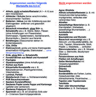 Nachfolgend eine Auflistung der Wertstoffe, die wir in Kindsbach annehmen bzw. aus Platzgründen nicht annehmen können