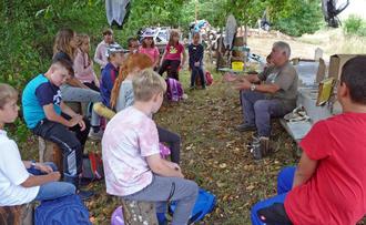 Der Imkerverein Landstuhl lud im Rahmen des Ferienprogramms der Verbandsgemeinde Ramstein-Miesenbach am Mittwoch, 27. Juli, nach Schrollbach auf eine Waldwiese, um den anwesenden 14 Buben und Mädchen die Imkerei näherzubringen. Wie seit mehreren Jahren wurden die jungen Leute hervorragend betreut von dem erfahrenen Imker Eckhard Richter und seinen drei Helferinnen. Herr Richter lehrte das junge Publikum über das Leben der Honigbienen, die mit der