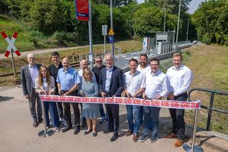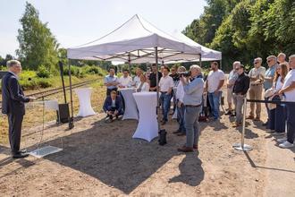 Dr. Klaus Vornhusen, Konzernbevollmächtigter der Deutschen Bahn AG für die Länder Rheinland-Pfalz und Saarland, Katrin Eder, Ministerin für Klimaschutz, Umwelt, Energie und Mobilität des Landes Rheinland-Pfalz, Ralf Guckenbiehl, Bürgermeister der Gemeinde Steinwenden, Ralf Leßmeister, Landrat des Landkreises Kaiserslautern, und Michael Heilmann, Verbandsdirektor Zweckverband Öffentlicher Personennahverkehr Rheinland-Pfalz Süd, machten sich gemeinsam mit weiteren geladenen Gästen und einigen Bürgern ein Bild vor Ort und weihten den Haltepunkt symbolisch ein.