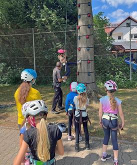 Im Reichswaldstadion hieß es für zwei Gruppen mit je zwölf Teilnehmenden: ab nach oben! Beim Baumkletter-Angebot mit Peter Kassel standen Abenteuer und Naturerlebnis im Vordergrund. Gut gesichert wagten sich die Kinder und Jugendlichen mutig in luftige Höhen. Die Aktion wurde mit großer Begeisterung aufgenommen und sorgte für strahlende Gesichter. Zum Abschluss gab es zur Belohnung wieder die begehrten Freikarten fürs Azur.