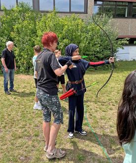 Auch in diesem Jahr war das Bogenschießen mit dem TV03 Ramstein wieder ein beliebter Programmpunkt des Ferienprogramms der Verbandsgemeinde. Auf dem Gelände an der Reichswald-Sporthalle zeigten erfahrene Bogenschützinnen und -schützen den Teilnehmenden die Grundlagen des traditionellen Sports. Die Kinder und Jugendlichen durften sich an der Zielscheibe ausprobieren und zeigten dabei großes Geschick und Konzentration. Als Anerkennung gab es Freikarten für das Freizeitbad Azur von Beigeordnetem Marcus Klein.