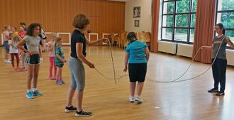 Am 25. Juli hieß es im Bürgerhaus von Hütschenhausen für 20 junge Damen, volle Konzentration zu bewahren. Rope Skipping war angesagt. Unter fachkundiger Anleitung von Christine Mahl wurden Sprungfolgen in unterschiedlichsten Schwierigkeitsgraden geübt. Ging es am Anfang bei einfachen Grundsprüngen noch recht gemütlich zu, steigerte sich das Tempo und die Anforderung bei der Ausführung etwas komplizierteren Sprüngen kontinuierlich. Höhepunkt war das Springen im Langseil, mit gleich zwei Seilen. Eine echt schwere Übung.