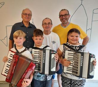 Wie seit vielen Jahren, so bot der Akkordeon-Club Ramstein-Miesenbach auch 2022 ein Schnupperprogramm für Akkordeon und Keyboard an. Der Dirigent des Akkordeonorchesters, Waldemar Waßmann, und Solist Michael Christof hatten ein auf die Wünsche der Kinder zugeschnittenes Programm vorbereitet. So waren die 90 Minuten kurzweilig und den Kindern hat vor allem Spaß gemacht, die Tasteninstrumente auch selbst ausprobieren und spielen zu dürfen. So konnten am Ende des Tages Liedteile schon fast fehlerfrei gespielt werden! Freikarten fürs AZUR waren der Lohn für die gezeigten Leistungen! Unser Bild zeigt die Programmverantwortlichen Christof und Waßmann mit dem ersten Vorsitzenden des Akkordeon-Clubs, Horst Cherdron, sowie den Kindern Aiden Ashbrook, Frieda Brauchler und Hannes Walter.