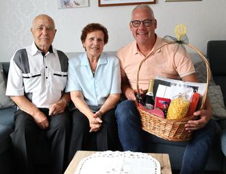 Am 5. August vor 65 Jahren haben sich Tamara und David Urich das Ja-Wort gegeben und vergangene Woche Dienstag, konnten beide bei sehr guter Gesundheit Ihr Ehejubiläum feiern. Mit der Familie wurde dann am Wochenende gemeinsam gefeiert. An der Wolga geboren, kam das Ehepaar 1990 nach Deutschland und ist hier heimisch geworden. Der ausgebildete Maschinenschlosser arbeitete immer in seinem Beruf und war auch noch als Dreher in Kaiserslautern bis zu seinem Ruhestand tätig. Tamara Uhrig gehörte bis zu ihrem Ruhestand als „gute Seele“ zum Team des damaligen Miesenbacher „Albert Schweitzer“ Kindergartens. Bürgermeister Ralf Hechler gratulierte im Namen der Stadt Ramstein-Miesenbach den beiden herzlichst und überreichte einen schönen Präsentkorb. Er wünschte weiterhin viel Gesundheit und noch viele weitere gemeinsame Jahre. (Foto: J. Schirra)