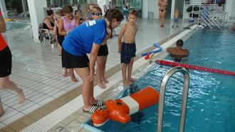 Vom Kanufahren bis Kleiderschwimmen, Rettungsübungen an Schwimmpuppen, Hindernistauchen und vieles mehr - war alles vertreten. Die Lebensrettung mit Befreiungsgriffen und das Rettungsschwimmen wurden den interessierten jungen Leuten sachkundig von Lukas Wagner vom DLRG-Ortsverein als Organisator und seinen sechs Helferinnen und Helfern beigebracht. Betreut und bewacht wurde alles von vereinseigenen, erfahrenen Helfern und Betreuern des DLRG Ramstein. Für die teilnehmenden Kinder am Ferienprogramm im AZUR war dieser Tag ein Vergnügen, schöner hätte es an einem Badestrand auch nicht sein können, kommentierte der Beigeordnete der Verbandsgemeinde Ramstein-Miesenbach, Dr. Heinrich, der mit anwesend war. Den ehrenamtlichen Helfern vom DLRG zollte er für ihr Engagement großen Respekt und Anerkennung.