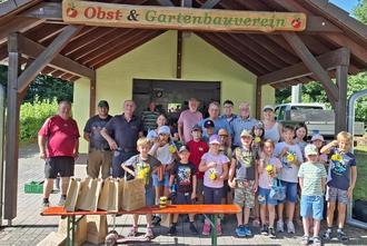 Erstmalig im Ferienprogramm dabei, hatte der Obst- und Gartenbauverein Miesenbach für Freitag, den 8.August zu einem Workshop mit dem Thema „Wir bauen ein Insektenhotel“ auf den ehemaligen Sportplatz Kiefernkopf eingeladen. Am Vereinsheim konnten der Organisator Bernd Lang 16 Kinder begrüßen. Gemeinsam mit den Kindern und vielen fleißigen Helfern wurde ein großes altes Wagenrad mit verschieden Materialen bestückt, um ein schönes Bienen- und Insektenhotel herzustellen. Dieses wird später, wie der Vorsitzende des Vereins Lothar Urschel erklärte, auf der Streuobstwiese in der Nähe des „Waldgartens“, welche der Verein pflegt, gemeinsam mit den Kindern aufgestellt. Damit die Kinder auch ein eigenes Insektenhotel für zuhause haben, durften sie sich aus großartig gestalteten Dosen eines selbst bauen. Dazu haben sie verschiedene Bambusröhren zu einem Bündel zusammengepasst und das untere Ende mit Lehm verschlossen. Diese wurden dann in die Dosen geklebt. Versehen mit einer Aufhänge Schnur können nun diese im Garten aufgehängt werden. Ein großartiges Erinnerungsstück fand der Beigeordnete Roland Palm, der als Vertreter der Verbandsgemeinde, die Schwimmbadkarten für die Kinder und den Dank an den Obst- und Gartenbauverein Miesenbach und die Helfer überbrachte.