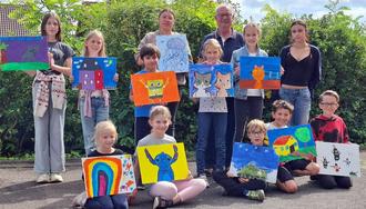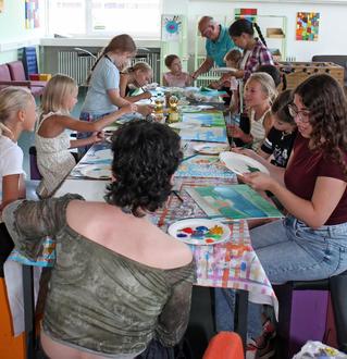 Der Maler Hans Roßberger beteiligt auch dieses Jahr wieder mit zwei Terminen an unserem Ferienprogramm. 24 Jungen und Mädchen haben sich von Herrn Roßberger in die Kunst des Malens mit Acryl einführen lassen. Der Beigeordnete der VG Roland Palm war sehr angetan welche großartigen Bilder hier entstanden sind und wie konzentriert die Kinder zu Werke gegangen sind. War die Pinselführung am Anfang noch etwas ungelenkt, so wurde es durch die hervorragende Anleitung von Herrn Roßberger immer besser und es kamen wieder wundervolle Werke zustande.