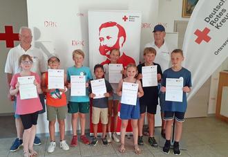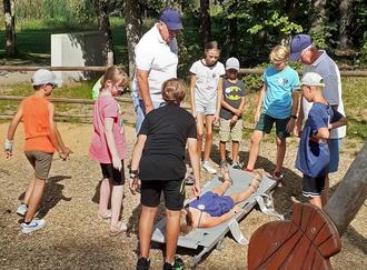Wenn Gefahr in Verzug ist muss der Rettungswagen und der Notarzt gerufen werden. Auch das wurde geübt. Die Notfallrufnummer 112 und wie man sich dabei am Telefon oder Handy verhält, war ein wichtiger Teil des Programms. Aufmerksam nahmen die jungen Leute das Gelernte auf. Am nahegelegenen Seewoog wurde die stabile Seitenlage geübt und das Tragen von Verletzten unter Einsatz von Rettungsbahren. Manuela Krauß und die betreuenden Mitglieder aus dem DRK Ortsverein Moorbachtal gaben ihr Bestes, was von dem Beigeordneten der Verbandsgemeinde, Dr. Werner Heinrich, dankend gewürdigt wurde. Die beteiligten Kinder bekamen seitens der Verbandsgemeinde jeweils eine Freikarte für das Sport- und Freizeitbad AZUR, was bei den hochsommerlichen Temperaturen an diesem Tag gerne angenommen wurde. Zum Abschluss erhielten alle teilnehmenden Kinder eine Urkunde vom Roten Kreuz, worauf sie mit Recht stolz sein können!