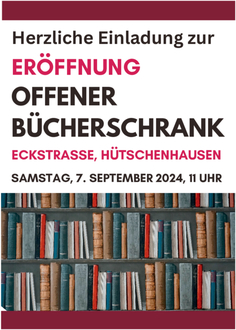 Am Samstag, dem 7. September, um 11 Uhr, wird der „Offene Bücherschrank“ Hütschenhausen eröffnet. Der Offene Bücherschrank steht zu Beginn der Eckstraße in Hütschenhausen auf dem dortigen kleinen Platz. Zur Eröffnung sind alle an Büchern Interessierten herzlich eingeladen.