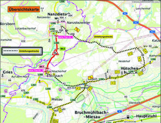Die Umleitung erfolgt durch Hütschenhausen über die L 356 und über die K 6, K 4 sowie die K 59. Die Umleitung ist ausgeschildert.