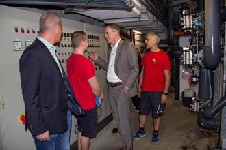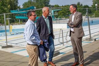 Michael Ebling (rechts), Innenminister von Rheinland-Pfalz, ließ sich von Bürgermeister Ralf Hechler (Mitte) und 1. Beigeordneten Marcus Klein (links) über die Situation im Freizeitbad Azur informieren.