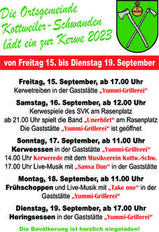Am Freitagabend ab 17.00 Uhr beginnt das Kerwetreiben in der Gaststätte „Yummi Grillerei“ in der Sulzbachhalle. Nach den Kerwe-Fußballspielen am Samstag spielt die Band „Unerhört“ am Rasenplatz des SVK. Die Gaststätte ist ebenfalls geöffnet. Der Kerweplatz mit Kinderkarussell und Süßigkeitenstand ist ab dem Nachmittag geöffnet. Der Sonntag gehört den Straußbuwe und –mäd und dem Musikverein Kottweiler-Schwanden. Im Anschluss an die Kerwerede um 14.00 Uhr unterhält der MV Kottweiler-Schwanden die Gäste vor der Sulzbachhalle. Ab 17.00 spielt das Duo Sansa in der Gaststätte „Yummi Grillerei“. Der Frühschoppen am Montagmorgen in der „Yummi-Grillerei“ beginnt um 11.00 Uhr. Mit Live-Musik sorgt ab 12.00 Uhr „Take one“ für Stimmung.