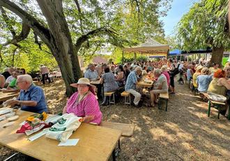 Bei herrlichem spätsommerlichem Wetter konnten die Besucher frische Dampfnudeln mit Wein- und Vanillesoße, „Grumbeersupp“, aber auch Torten und Kuchen, Hausmacher Wurst und „Weißer-Käs“-Brote genießen. Das übliche Getränkeangebot wurde ergänzt durch einen Sekt- und Prosecco-Stand sowie durch ein Kaffeemobil und für die musikalische Unterhaltung sorgte Matthias Divivier. An einem Stand mit antiquarischen Büchern und Schriften konnte in diesen gestöbert und sie bei Interesse erworben werden. Aber auch selbst gemachte Marmelade sowie Honig und Kartoffeln wurden am Rande des Festes angeboten.