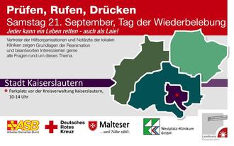 Im Rahmen der bundesweiten Woche der Wiederbelebung (16. bis 22. September) veranstaltet die Rettungsdienstbehörde der Kreisverwaltung Kaiserslautern in Kooperation mit dem Westpfalz-Klinikum GmbH, Standort I am 21. September einen Tag der Wiederbelebung. Veranstaltungsort ist der Parkplatz vor der Kreisverwaltung, Lauterstraße 8 in Kaiserslautern, von 10 bis 14 Uhr.