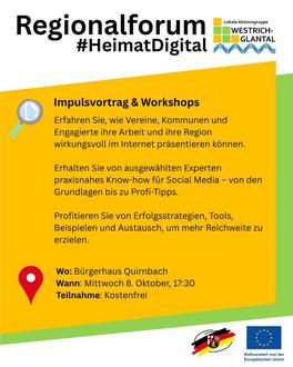 Die Lokale Aktionsgruppe (LAG) Westrich-Glantal lädt am 8. Oktober 2025 zum Regionalforum #HeimatDigital ins Bürgerhaus Quirnbach ein. Ziel der Veranstaltung ist es, Vereine, Kommunen sowie engagierte Bürgerinnen und Bürger dabei zu unterstützen, ihr Engagement, ihre Arbeit und ihre Region im Internet wirkungsvoll zu präsentieren.