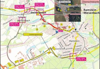 Wie der Landesbetrieb Mobilität (LBM) mitteilt, wird die Landesstraße L 363 zwischen Ortsausgang Ramstein, Am Großacker und dem Knoten L 363 / L 366 am Ortseingang von Steinwenden ab Montag, 21. Oktober, bis zum 9. November 2024 für den Verkehr voll gesperrt. Grund dafür sind Sanierungsarbeiten an der Fahrbahn und an dem straßenbegleitenden Radweg. Die Umleitung über die L 356 und die K 9 über Weltersbach nach Steinwenden und umgekehrt wird ausgeschildert. Die Zufahrt zur Straße Am Großacker in Ramstein ist weiterhin möglich.