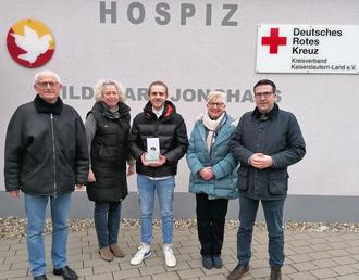 Zur Spendenübergabe im Hospiz empfing ihn Hospizmitarbeiterin Martina Pfiffi zusammen mit den Vorstandsmitgliedern Marcus Klein, Dr. Hans-Jürgen Gabriel und Vera Lang, die das Amt der Schatzmeisterin von Herrn Adolf Geib im Förderverein Stationäres Hospiz Westpfalz e.V. übernommen hat. Die Vorstandsmitglieder bedankten sich für die großzügige Spende.