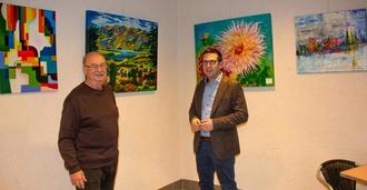 Der 1. Beigeordnete der Verbandsgemeinde Marcus Klein (rechts) bedankte sich bei Hans Roßberger (links) für die Ausstellung der Bilder im Ramsteiner Freizeitbad Azur (Foto: St. Layes).