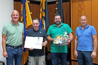 Bürgermeister Ralf Hechler (links) überreichte Matthias Rudig (2.v.l.) die Dankurkunde des Landes. Für das Kanalwerk der Verbandsgemeinde schlossen sich (v.r.n.l.) Steffen Harth und Thomas Altherr den Glückwünschen an. (Foto: Joshua Schirra)