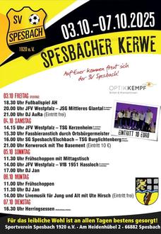 vom 3. bis 7. Oktober 2025 laden wir Sie herzlich zur Spesbacher Kerwe ein! Freuen Sie sich auf spannende Fußballspiele, den traditionellen Fassbieranstich, gesellige Frühschoppen, schwungvolle Livemusik am Abend und ein buntes Kerwetreiben für Jung und Alt. Gemeinsam mit dem SV Spesbach und den Schaustellern feiern wir wieder rund um das Sportheim in Spesbach.