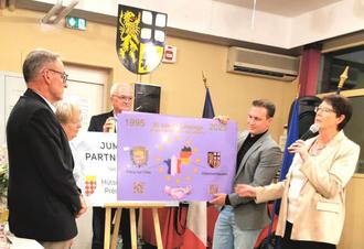 Vorausgegangen waren Grußworte der Bürgermeister, Philippe Eloy und Achim Wätzold, des Altbürgermeisters Paul Junker sowie der Vorsitzenden der Partnerschaftsvereine, Evelyne Choupeaux und Bertram Müller, französisch unterstützt von Eliane Berg. Alle würdigten die vergangenen dreißig Jahre, in denen viele der Mitglieder und Freunde gealtert sind bzw. uns schon verlassen haben. Besonders zum Ausdruck gebracht wurde der Fortbestand der freundschaftlichen Verbindungen über Grenzen hinweg, die gerade in der heutigen Zeit wieder von großer Bedeutung sind.