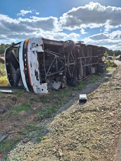 Beim zweiten Einsatzszenario wurde die Wehr zu einem Verkehrsunfall mit einem Bus alarmiert. Hier ging man von etwa 25 Insassen aus. Beim Eintreffen des Rettungszuges an der Einsatzstelle hatten die Übungsvorbereiter ganze Arbeit geleistet. Ein PKW mit einer eingeklemmten Person war mit dem Bus kollidiert, der auf die Seite gekippt war. Die Verletztendarsteller waren durch das DRK Ramstein geschminkt, um bei den verschiedenen Verletzungsmustern zusammen mit dem Rettungsdienst hier sehr realistisch arbeiten zu können. Der Bus wurde nach Sichtung und Rücksprache mit dem Rettungsdienst geräumt. Die Schnelleinsatzgruppe (SEG) Sanitätsdienst und die SEG-Betreuung des Katastrophenschutzes kamen hier ebenso zum Einsatz wie der leitende Notarzt und der Organisatorische Leiter Rettungsdienst. Alle „Verletzten“ wurden gerettet, erstversorgt und dann in die umliegenden Krankenhäuser verbracht.