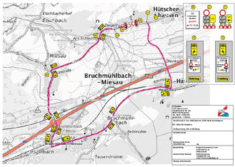 Die Umleitungsstrecke ab der Hauptstuhler Straße über Hauptstuhl, Bruchmühlbach, Miesau zur Ziegelhütte - und selbstverständlich auch gegenläufig - ist ausgeschildert und dem Plan zu entnehmen.