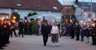 Mit einem Dankgottesdienst in der festlich geschmückten Kirche unter der Leitung der Pfarrer Pious und Bernhard Schäfer sowie Diakon Martin Pletsch dankte Preis, dass während seiner Amtszeit alle Feuerwehrleute unbeschadet aus ihren Einsätzen zurückgekommen sind. Anschließend wurde der scheidende Wehrleiter mit seiner Ehefrau Karla über einige Umwege zurück zur neu gestalteten Feuerwache gefahren. Dort standen dann die Feuerwehrleute der Verbandsgemeinde, die Kinderfeuerwehr und die Jugendfeuerwehr mit Fackeln bereit, um ihren Wehrleiter in die Feuerwache zu geleiten.