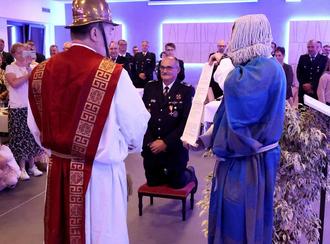 Als Franz-Josef Preis ein paar abschließende Worte an die Anwesenden richten wollte wurde er jäh an seinem Vorhaben gestört. Die Knappen derer zu Feurio betraten den Saal, um dem Wehrleiter a.D. die höchste Ehre zukommen zu lassen, welche die Feuerwehr Ramstein-Miesenbach zu vergeben hat. Franz-Josef Preis wurde zum Ritter derer zu Feurio geschlagen. Er steht nun in einer langen Reihe von verdientesten Feuerwehrleuten und darf sich nun „Ritter Sepp vom Eck, Erneuerer der Wehr, Pfalzgraf zu Bavaria“ nennen.