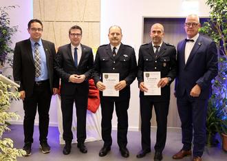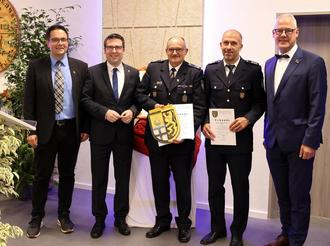 Landrat Ralf Leßmeister und die erste Kreisbeigeordnete Gudrun Hess-Schmitt dankten Preis für seine geleistete Arbeit auch auf Kreisebene. Im Namen des Innenministers Michael Ebling verliehen sie Preis das Goldene Feuerwehr-Ehrenzeichen am Bande für hervorragende Verdienste um das Feuerwehrwesen des Landes Rheinland-Pfalz.